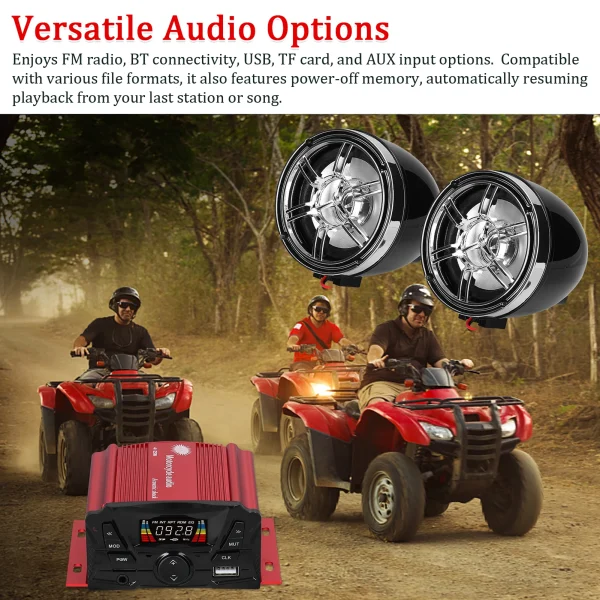Versatile Audio Options: Enjoys FM radio, BT connectivity, USB, TF card, and AUX input options. Compatible with various file formats, it also features power-off memory, automatically resuming playback from your last station or song.